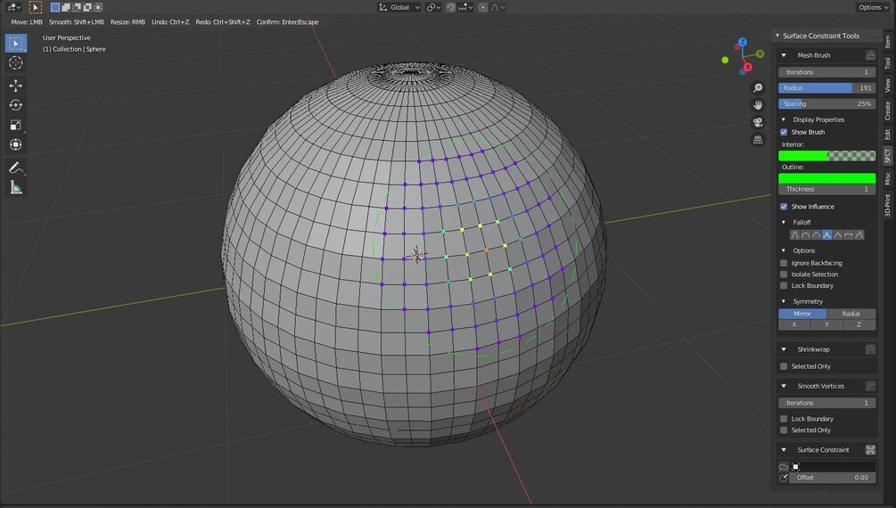 For example, the “Surface Constraint” section of the UI, as seen above, allows a user to select a target on which to constrain the vertices of the active mesh. The “Mesh Brush”, “Shrinkwrap”, and “Smooth Vertices” operators comply with this constraint. Moreover, if you would like for the constraint to affect all mesh operators, simply enable the button with the car icon.